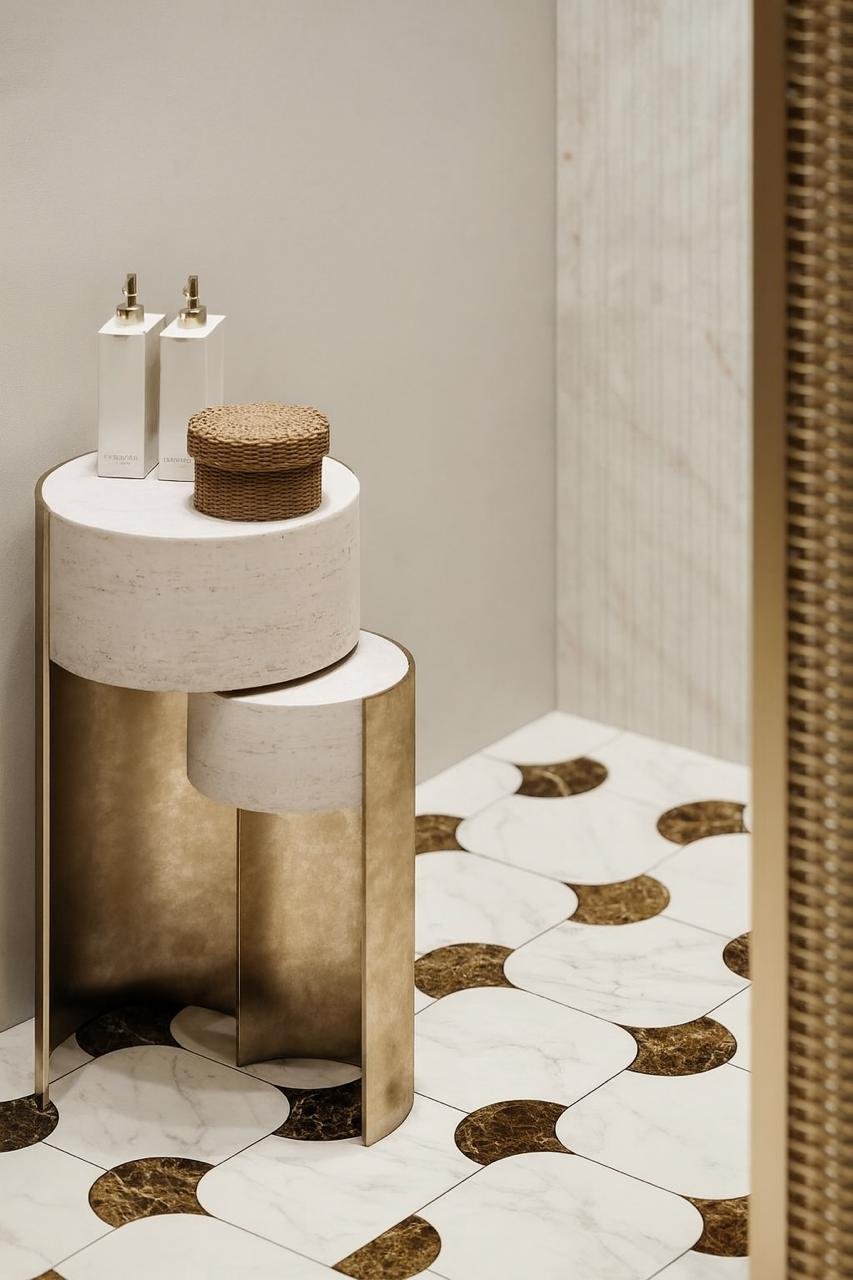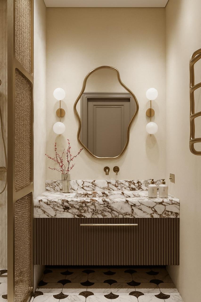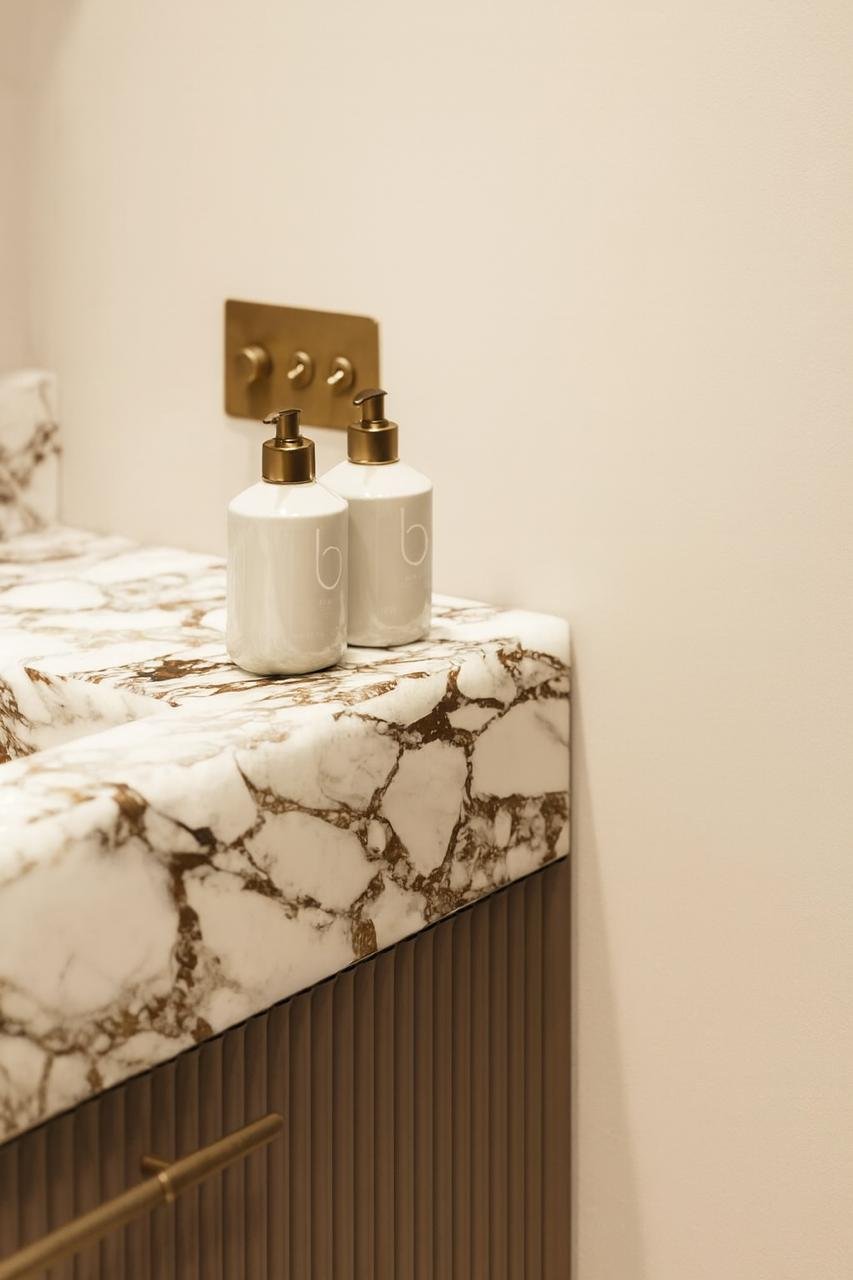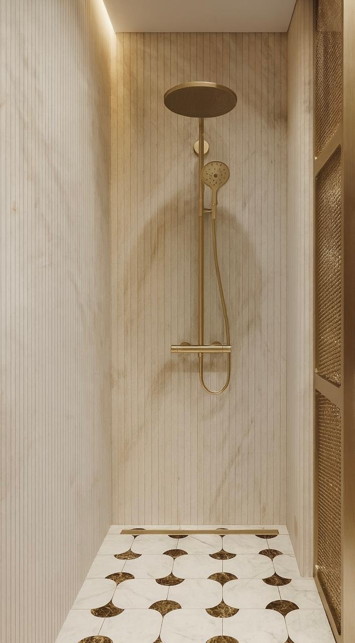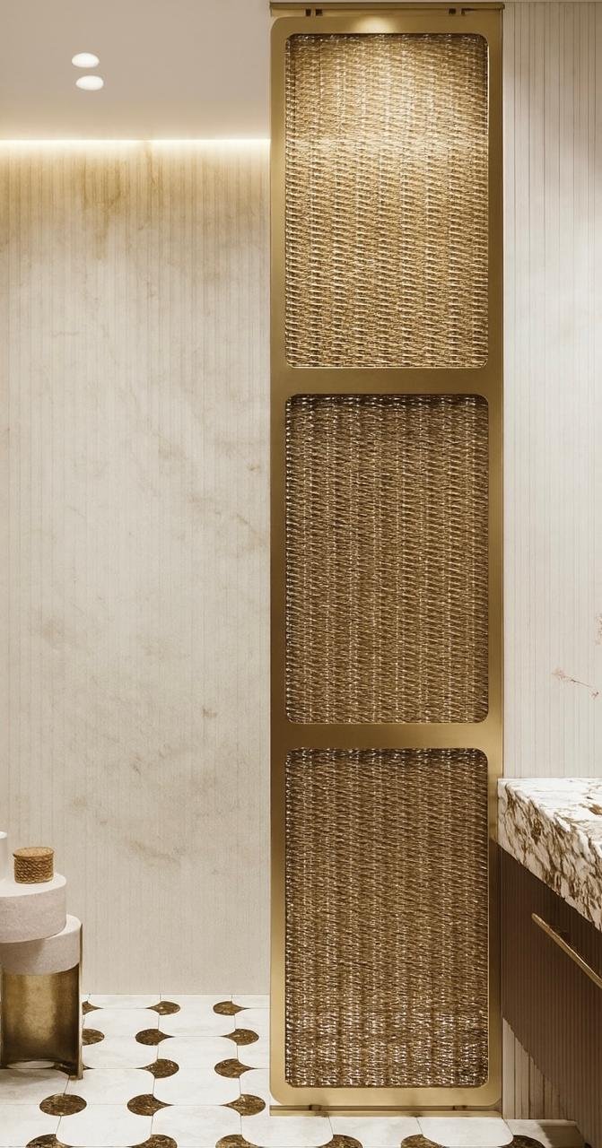 Warm marble with expressive veining meets brushed brass accents, woven metallic panels, and soft lighting that wraps the space in a golden glow. The interplay between smooth stone, tactile metal, and gentle illumination creates an atmosphere of calm luxury — a sanctuary where contemporary elegance meets organic warmth