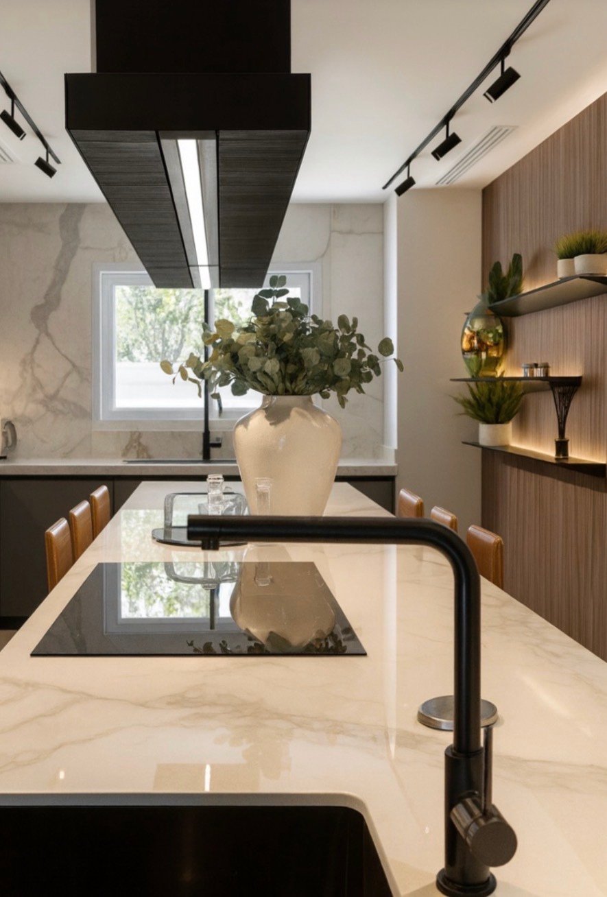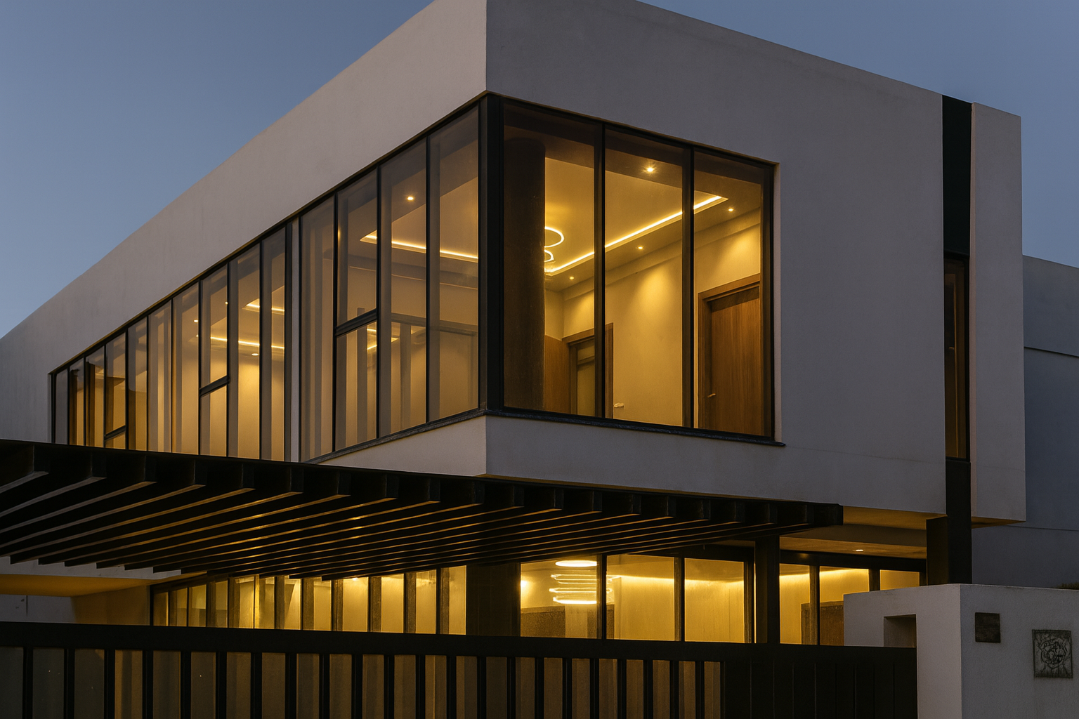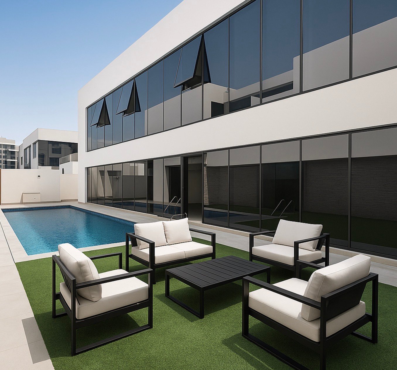 It was a full villa renovation project, where we completely removed all previous materials and replaced them with new finishes and modern elements. The exterior design was entirely reimagined by breaking the old windows and installing large black-framed openings to bring in more natural light and create a contemporary architectural look.